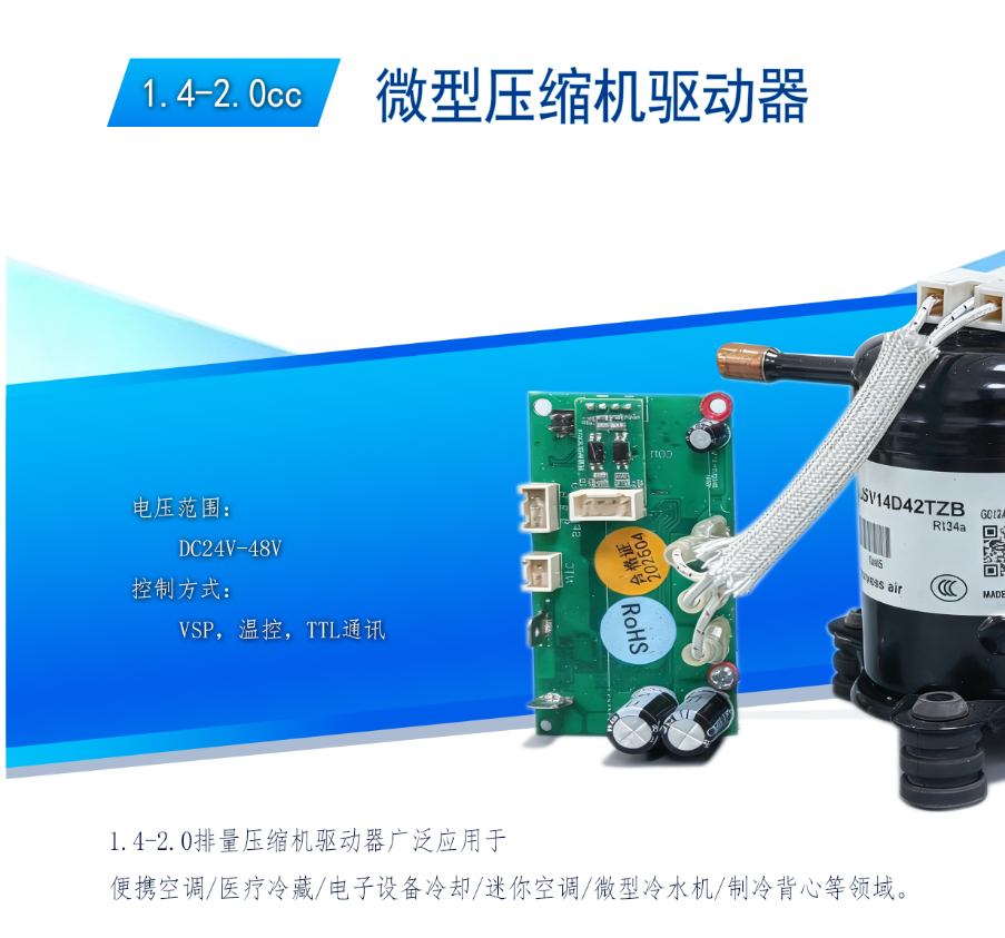 DK1.4-2.0cc微型压缩机控制器系列是河北顶控新能源科技有限公司自主研发的适用于便携空调/医疗冷藏/电子设备冷却/迷你空调/微型冷水机/制冷背心/手提空调/帐篷空调压缩机控制器。
